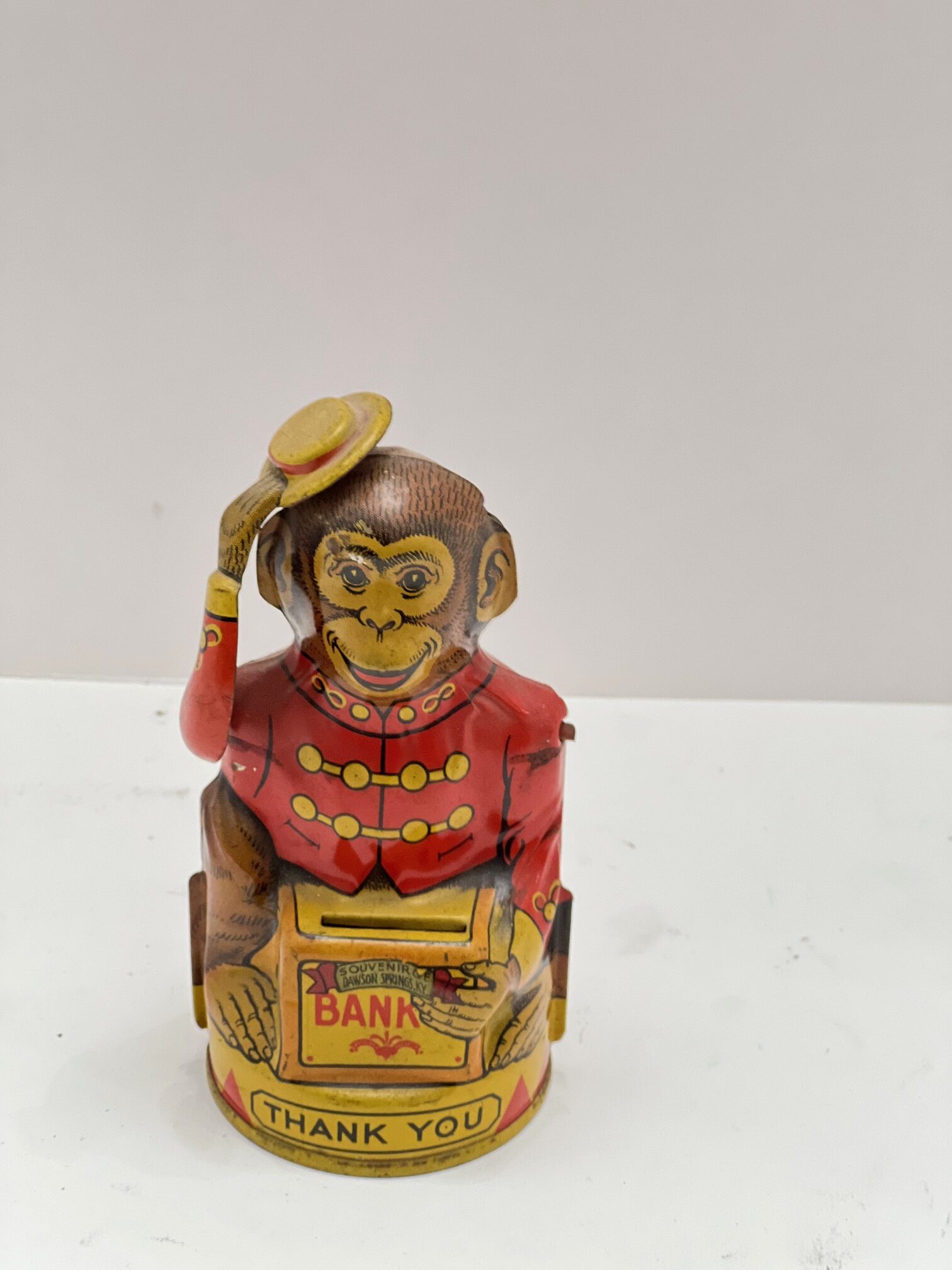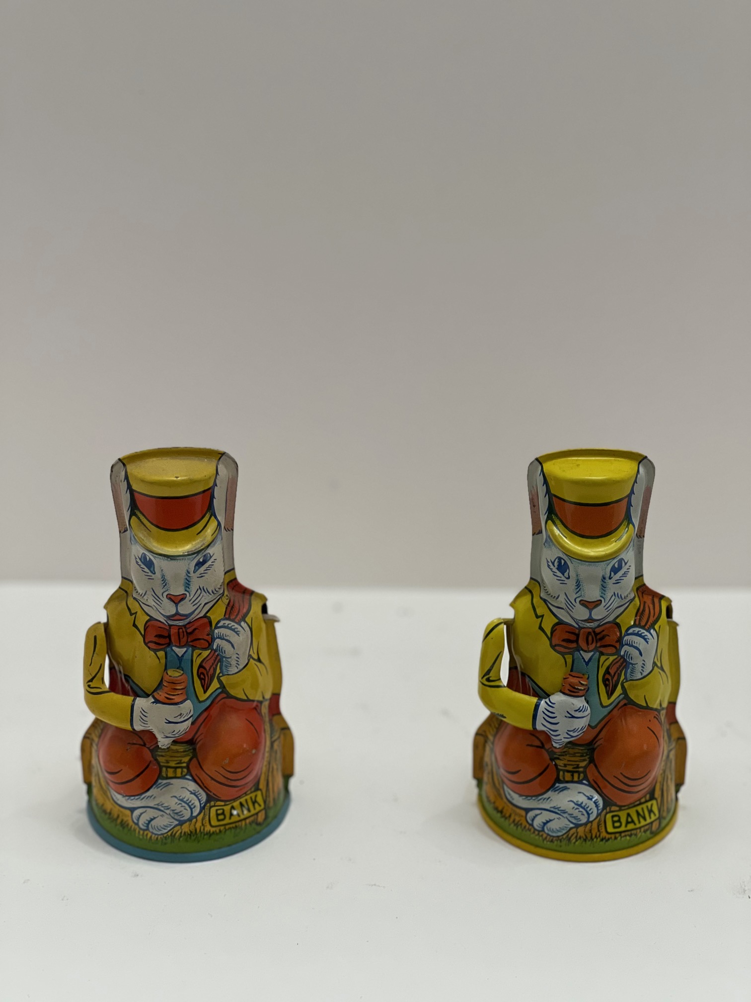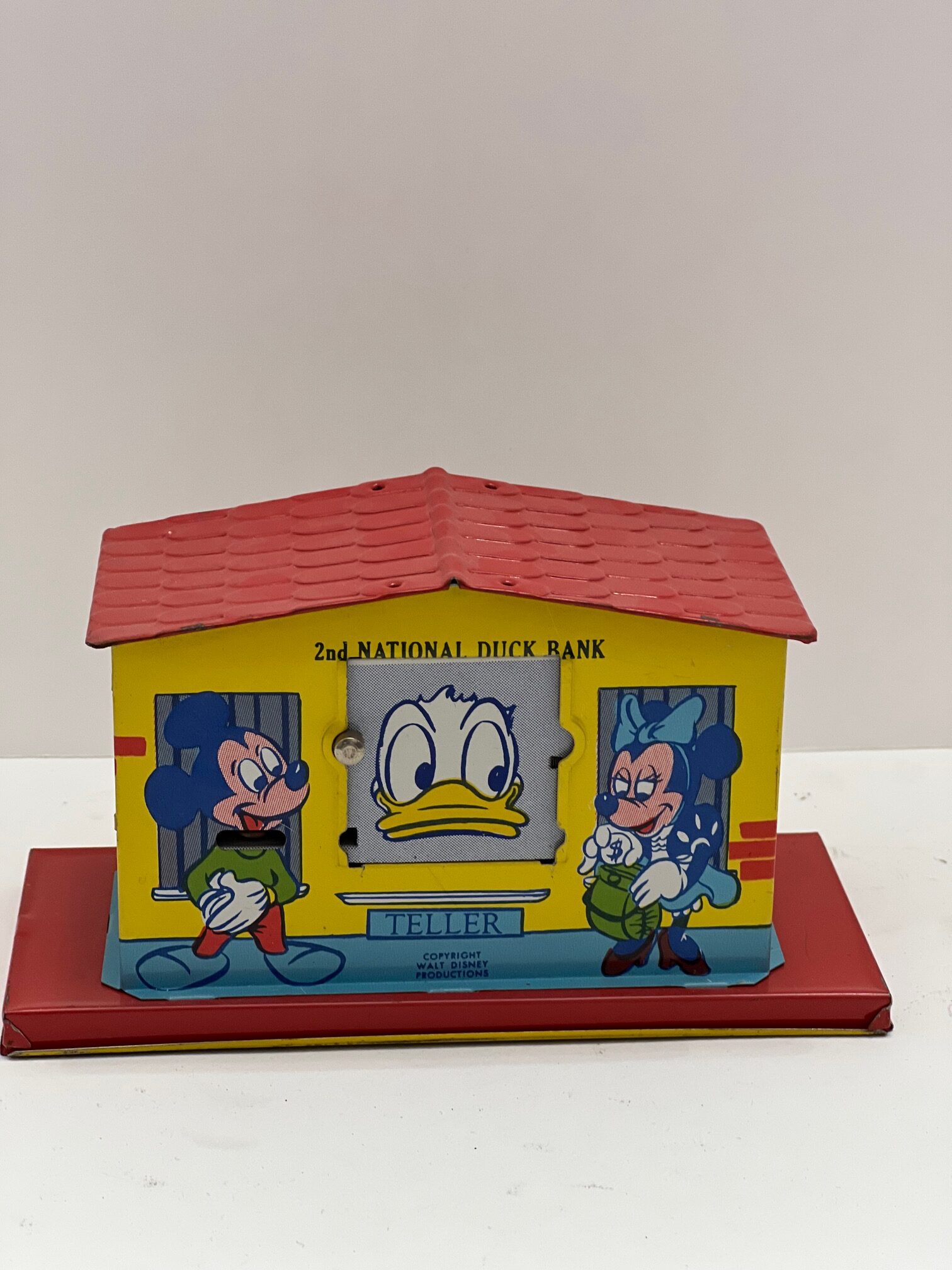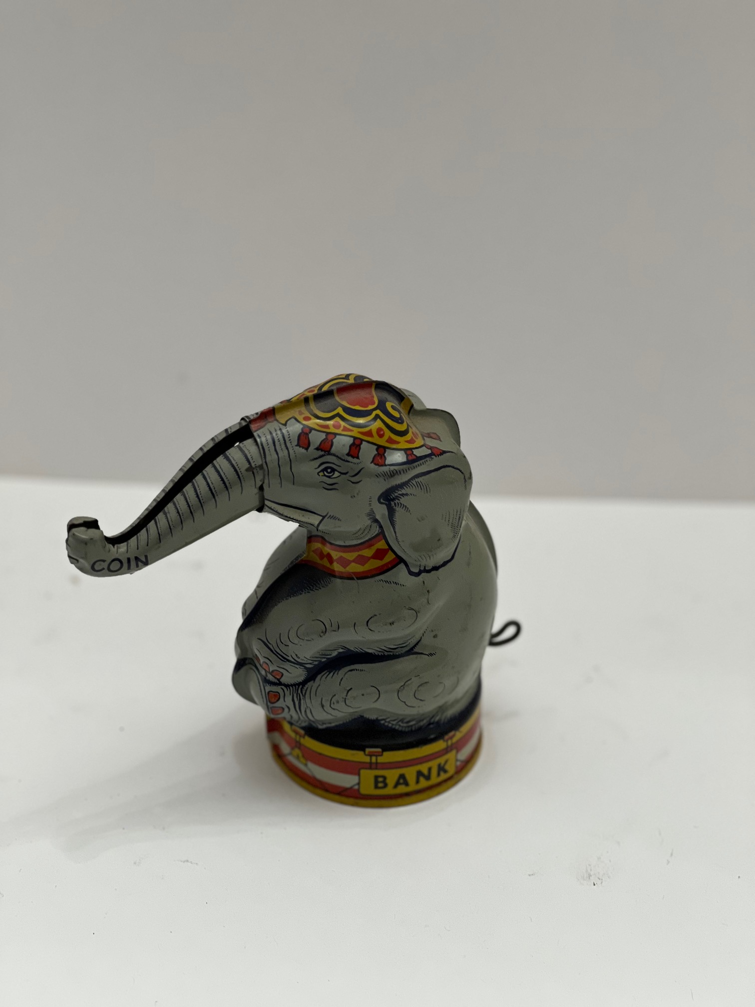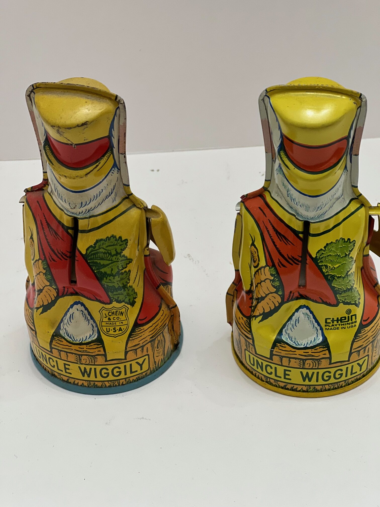 J. Chein & Company of New Jersey produced a line of colorful tin lithographed toys from the 1930s through the 1970s. Among these were 6 mechanical banks, four of which are of the bust variety and two of which were small tin buildings banks. Though they basically stayed the same throughout their production, they did evolve. Initial banks from the 30s have a hinged square trap on their base and one form of the company logo. Banks from the late 40s and 50s, which are the most common to be found today, have a round circular trap that is that is removable in its base and a second form of the logo. Finally in the 1970s, a third run of the banks was produced with again a new logo, Chein Playthings, and the same circular trap. These late reproductions are surprisingly the hardest to find. The Chein banks include a Church building, a Donald duck building (known as the 2nd National Duck Bank), a clown bust, a monkey, an elephant, and lastly a rabbit called Uncle Wiggly. Chein banks were often used as tourist souvenirs and sometimes have stickers that were added to identify where they were sold as souvenirs. Of interest in the early 2020s, a company in Asia produced a cast iron version of the clown bust.