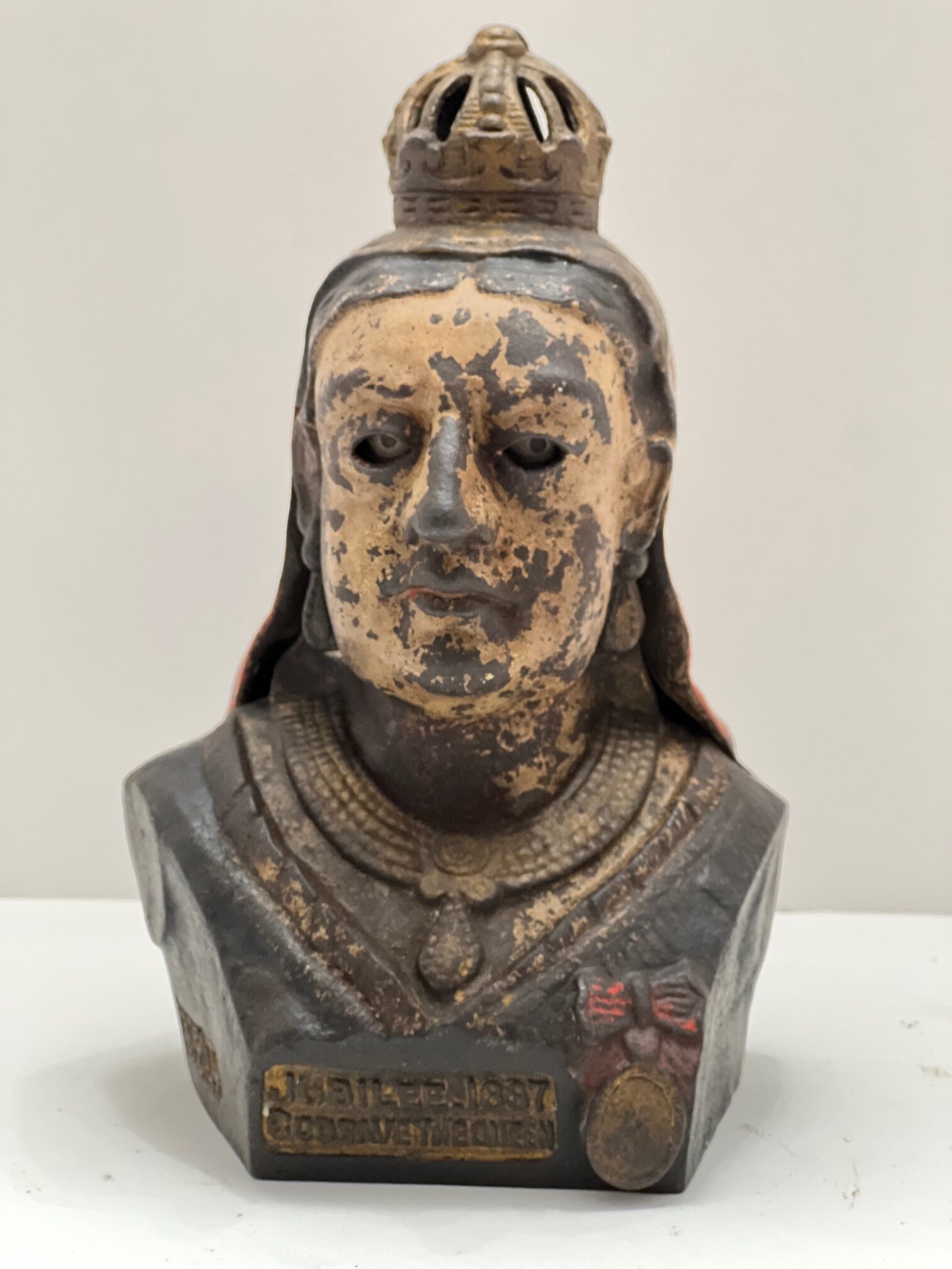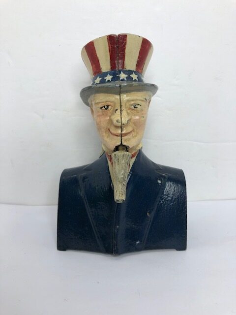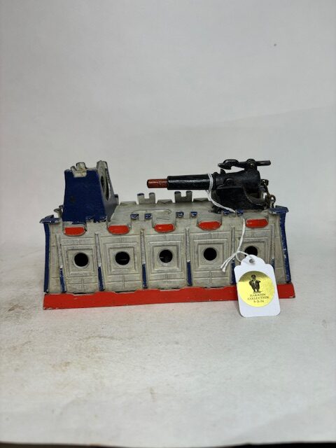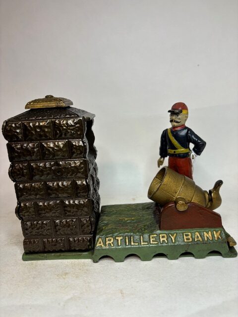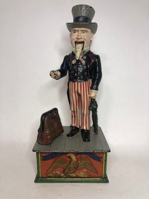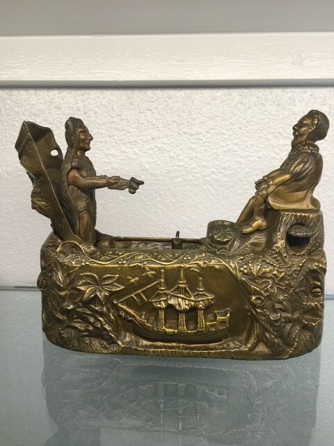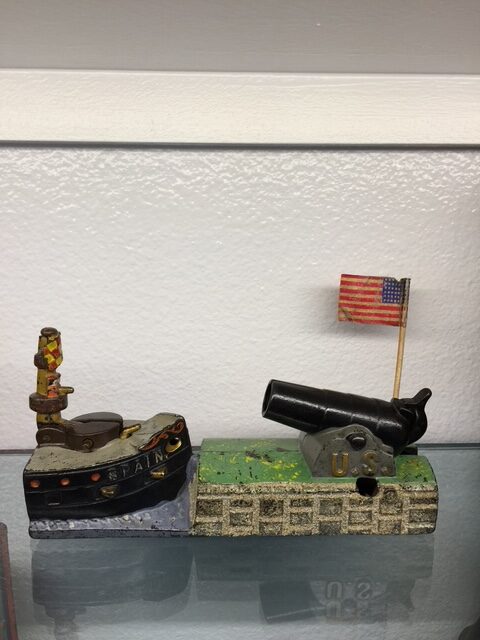 Politics, history, and current events have been a focus of mechanical banks since their inception. The first political bank was the Tammany bank produced by the J&E Stevens Company and meant to be a caricature of the New York Tammany hall leader Boss Tweed. It is activated by putting a penny into Boss Tweeds’s hand and the weight of the penny makes the arm move and drop the coin into his hip pocket. The next and most popular political bank created is the Uncle Sam bank from Shepherd Hardware. Today most of us think of Uncle Sam as a kindly father figure representing the spirit of the United States. In fact, if we look at the bank, he is anything but that. This Uncle Sam was initially created as the archetypical carpetbagger, a northerner who went to the South after the civil war to make his fortune at the expense of the defeated confederacy. We see a figure of Uncle Sam standing next to his carpet bag and holding an umbrella. A penny is then placed in his right hand and when the lever is pressed the carpet bag opens and he drops the penny into it. Presidents and elections have been a common focus. President Theodore Roosevelt and his love of hunting were the subject of two banks, Teddy and the Bear and the Lion Hunter. Other presidents such as Bill Clinton and Barack Obama have also been immortalized by banks. Most recently President Trump has been the subject of multiple banks some being pro Trump and others being anti Trump. Foreign leaders were also depicted such as Queen Victoria, Margaret Thatcher, and Chancellor Otto Von Bismarck. It should finally be noted that from the 1980s to the early 2000s, the modern bank designer, Charles Reynolds made a bank every four years to reflect the presidential election taking place. In terms of history, mechanical bank manufacturers would reflect their times going back to the discovery of the New World. The World’s Fair bank made for the Columbian Exposition (World’s Fair) of 1892 depicts Columbus meeting with an Indian. Though not historically accurate it reflected what the common conception of that time was. To coincide with the Centennial Celebration of 1876 in Philadelphia, Enterprise Manufacturing produced the Memorial Money Bank which features the Liberty Bell. In the same vein for the Bicentennial in 1976 Al Davidson created the Betsy Ross bank. Many wars were documented through the banks.