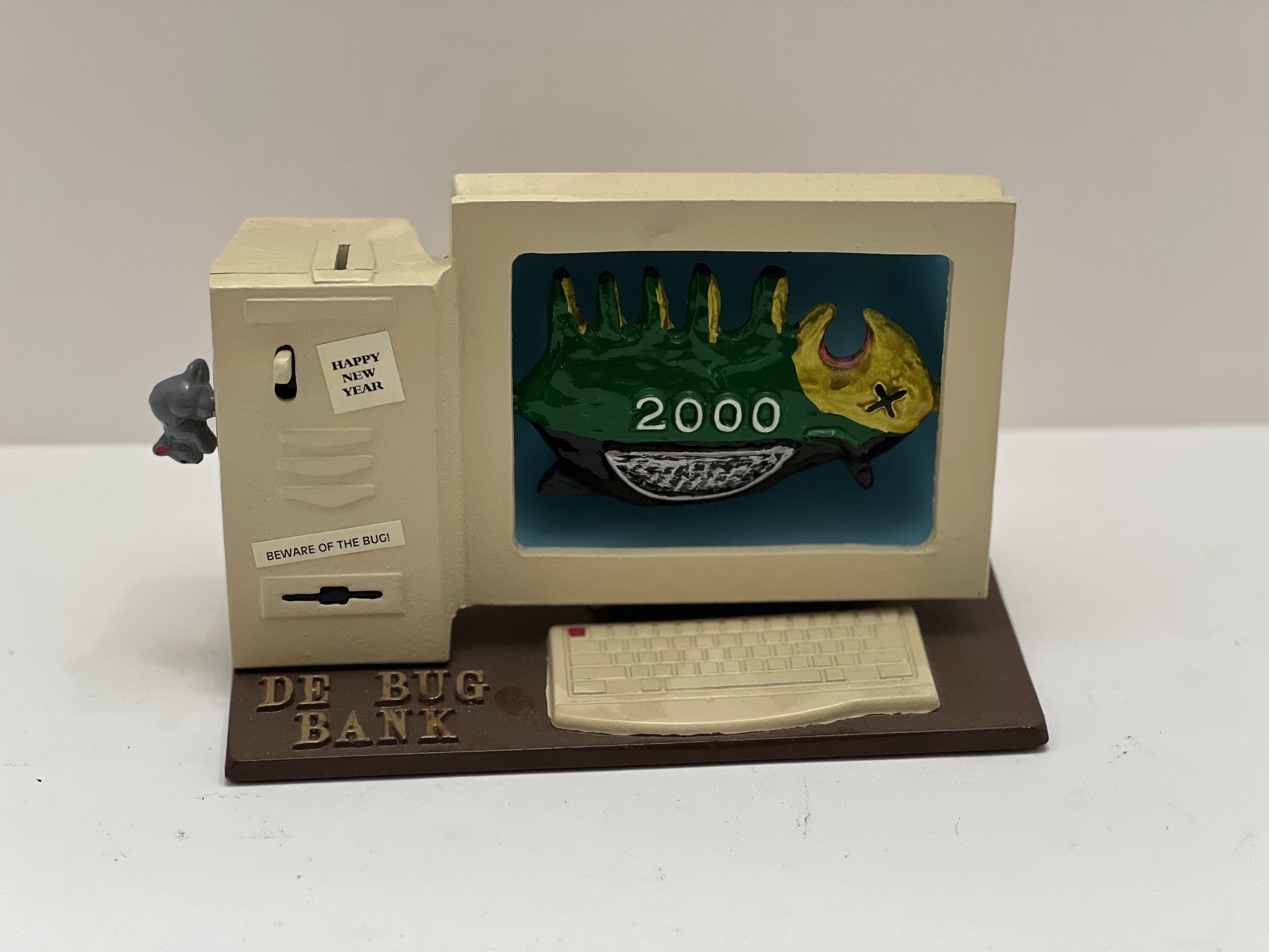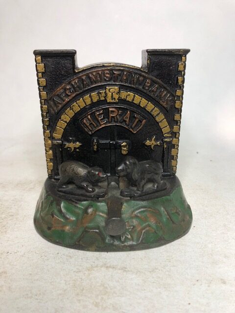 Examples of these are the Artillery banks depicting Civil War Soldiers and which came in Confederate and Union uniforms, the US and Spain bank for the Spanish American war, multiple banks for World Wars One and Two( these being mainly Anti-Hitler banks) and the Afghanistan bank, which symbolically reflected the war between Russia and Great Brittain over the control of Afghanistan. On another theme, the exploitation of Labor and it’s rise was reflected in banks such as the Breadwinners bank, which in one bank shows the relationship of the banker, the manufacturer, and the poor laborer in the first quarter of the twentieth century. More recently smart designers following the headlines developed items they thought would sell. An example of which was the perceived Year 2K Crisis reflected by two mechanical banks.