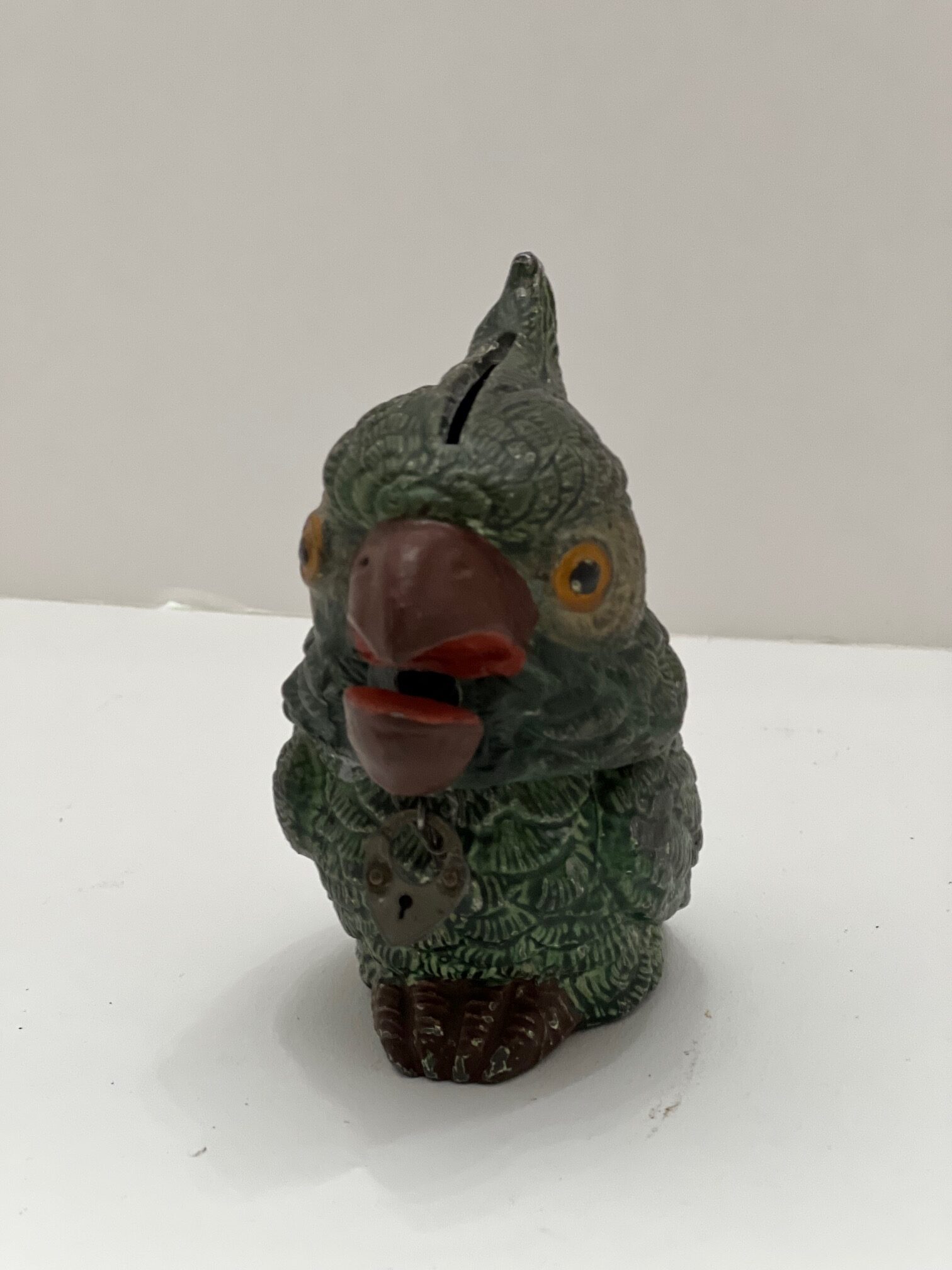 Made from soft zinc alloy, German spelter banks are rare survivors cherished by collectors—especially the whimsical spring jaw banks. These animal-themed designs, like the alligator and cockatoo, feature a charming coin-drop jaw wobble unique to this fragile form.