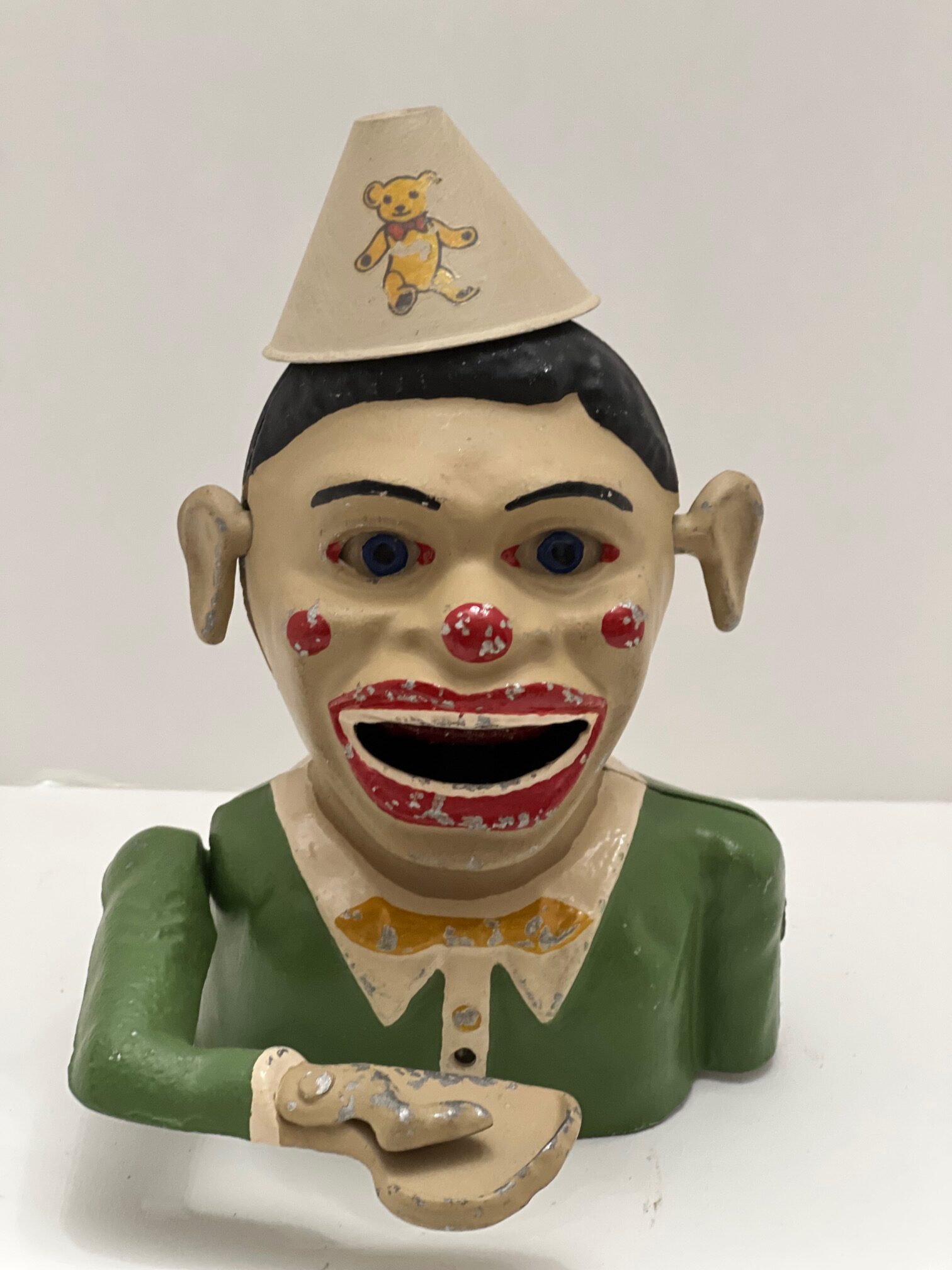Robert Eastwood Starkey of Burley England was the designer of mechanical banks in the first quarter of the 20th century. Primarily known for his jolly man banks, he also designed a Canon bank to commemorate World War One and a clown bust bank. Starkeys banks were made-up to the early 1950s and were made both in cast iron and later in aluminum. Later banks designed by him were manufactured by Thomas Ashworth and Company and carry the initials TACO on the casting.