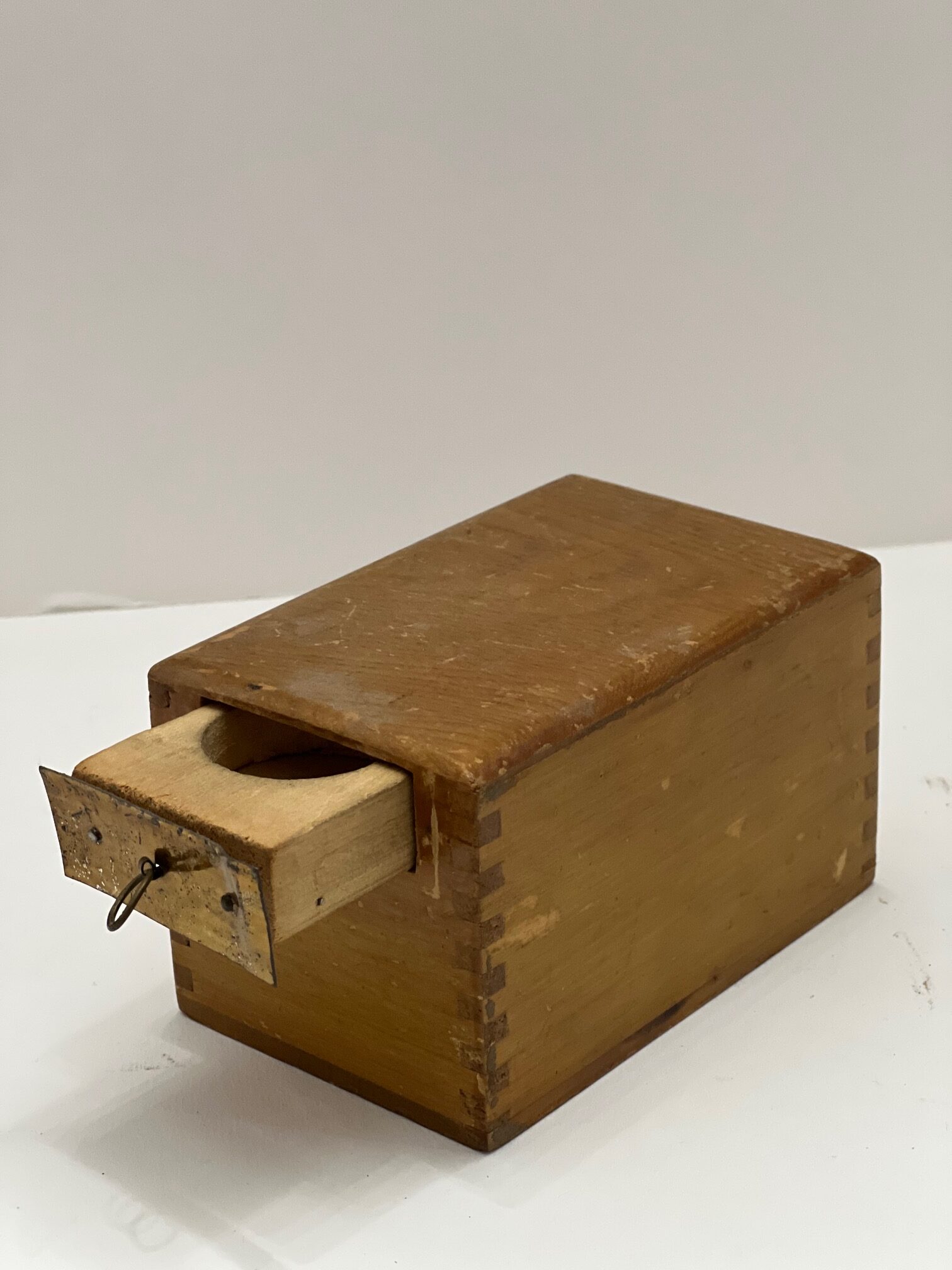 Though not as popular as other materials, banks were also made out of wood. They often were trick draw variants and mimicked furniture such as bureaus or drawers. Other wood banks are known as tilters and function by having a coin thrust into the bank as a figure leans to a building.